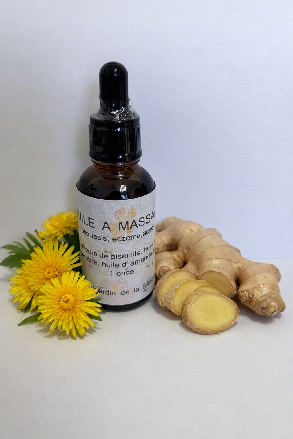 Contient: Fleurs de pissenlits, huile essentielle de gingembre et de l'huile d'amande douce.